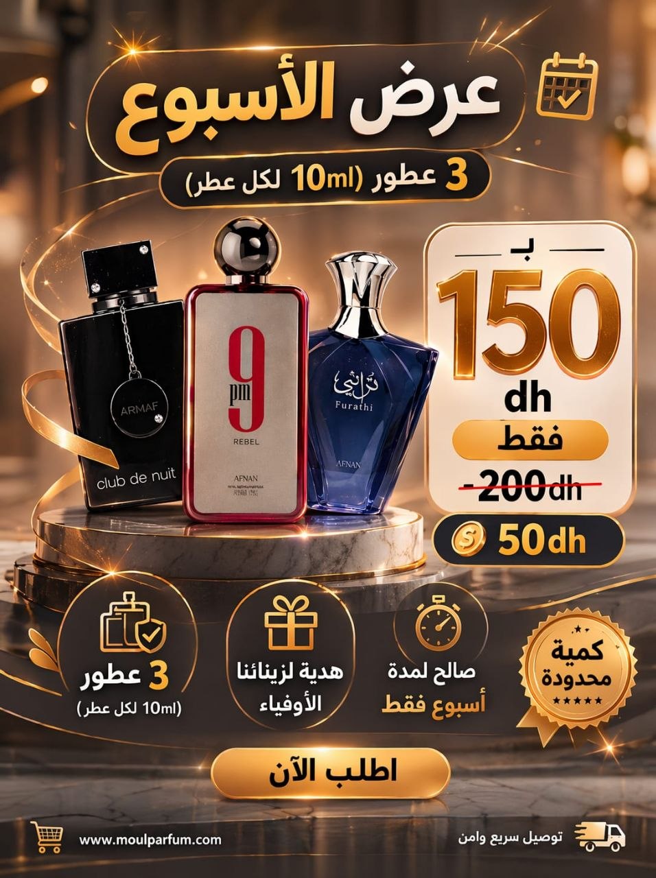 نقدم خدمة التوصيل إلى جميع المدن المغربية لضمان وصول عطركم المفضل أينما كنتم.